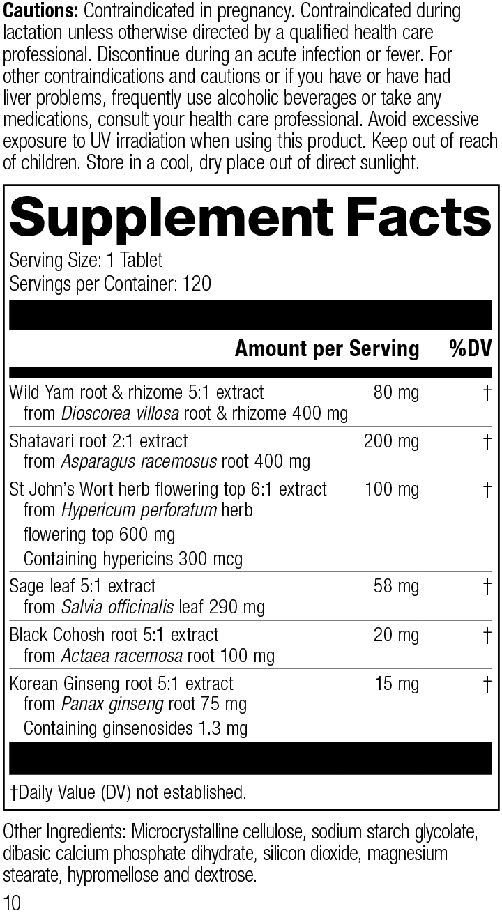 Each Serving Size (1 Tablet) contains: Wild Yam root & rhizome 5:1 extract 80 mg (from Dioscorea villosa root & rhizome 400 mg), Shatavari root 2:1 extract 200 mg (from Asparagus racemosus root 400 mg), St John’s Wort herb flowering top 6:1 extract 100 mg (from Hypericum perforatum herb flowering top 600 mg, Containing hypericins 300 mcg), Sage leaf 5:1 extract 58 mg (from Salvia officinalis leaf 290 mg), Black Cohosh root 5:1 extract 20 mg (from Actaea racemosa root 100 mg), Korean Ginseng root 5:1 extract 15 mg (from Panax ginseng root 75 mg, Containing ginsenosides 1.3 mg). Other Ingredients: Microcrystalline cellulose, sodium starch glycolate, dibasic calcium phosphate dihydrate, silicon dioxide, magnesium stearate, hypromellose, maltodextrin and dextrose.
